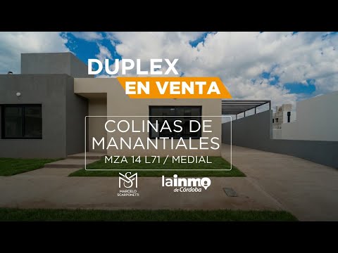 <p>En Colinas de Manantiales II. Este dúplex de 93 M² desarrollado íntegramente en Una sola Planta, en un terreno central de 174 M² a metros de la plaza del cuenta con:</p><p><br></p><div style="line-height: 1.5;">• Living comedor amplio e integrado</div><div style="line-height: 1.5;">• Cocina con muebles bajo mesada y sobre mesada</div><div style="line-height: 1.5;">• Horno eléctrico y anafe a gas de 4 hornallas</div><div style="line-height: 1.5;">• Desayunador en melanina.</div><div style="line-height: 1.5;">• Conexiones para lavarropas o lavavajillas</div><div style="line-height: 1.5;">• 1 dormitorio con placard completo</div><div style="line-height: 1.5;">• 1 dormitorio con vestidor completo</div><div style="line-height: 1.5;">• 2 baños completos (1 en suite, zonificado con Vanitory)</div><div style="line-height: 1.5;">• Patio en “L” con césped y asador</div><div style="line-height: 1.5;">• Cochera semi cubierta con Pergolado (4,70 m x 3,00 m)</div><div style="line-height: 1.5;"><br></div><div style="line-height: 1.5;"><div><span style="font-weight: bold;">Ubicación: </span>Colinas de Manantiales II / Manzana 71 / Lote 14 (medial)</div><div><br></div><div>• Superficie terreno de la unidad: 174,00 m²</div><div>• Superficie cubierta propia: 93,15 m² distribuidos en Planta Baja</div><div>• Superficie semi cubierta: 14,00 m² (cochera con Pergolado y lona antigranizo)</div><div><br></div></div><div style="line-height: 1.5;"><span style="font-weight: bold;">Detalles de categoría:</span></div><div style="line-height: 1.5;">• Aberturas exteriores de aluminio con DVH</div><div style="line-height: 1.5;">• Techos en doble altura en toda la propiedad.</div><div style="line-height: 1.5;">• Puerta de ingreso de chapa plegada n° 18</div><div style="line-height: 1.5;">• Sanitarios marca Roca en baños, bidet, duchas y lavabos</div><div style="line-height: 1.5;">• Sistema de calefacción central por caldera dual instalada (sin radiadores)</div><div style="line-height: 1.5;">• Preinstalación para aires acondicionados</div><div style="line-height: 1.5;"><span style="font-weight: bold;"><br></span>• <span style="font-weight: bold;">Fecha Estimativa de Entrega </span>Diciembre 2025.</div><div style="line-height: 1.5;"><span style="font-weight: bold;"><br></span></div><div style="line-height: 1.5;"><span style="font-weight: bold;">Colinas de Manantiales II Cuenta con:</span><br><span style="font-weight: bold;">- </span>Infraestructura subterránea</div><div style="line-height: 1.5;"><div><span style="font-weight: bold;">- </span>Seguridad 24/7.</div><div><span style="font-weight: bold;">- </span>Plazas con juegos</div><div><span style="font-weight: bold;">- </span>Calles pavimentadas</div><div><span style="font-weight: bold;">- </span>Colindante con el Boulevard Comercial</div><div><br></div></div><div style="line-height: 1.5;">-----------------------------------------<div><br></div><div><span style="font-weight: bold;">Legalidad:</span> Cesión de Boleto de compraventa.</div><div><br></div><div>-----------------------------------------</div><div><br></div><div>AVISO: Propiedad en venta con intermediación de LAINMO, profesional responsable Casas Díaz Nicolás Gustavo, CPI 5749. La información contenida en esta publicación es meramente referencial, los datos e imágenes publicadas no constituyen oferta alguna estando sujetos a disponibilidad y a la confirmación de el/los propietario/s por lo que sus términos no son vinculantes y pueden variar sin previo aviso. Los datos y valores contenidos en la publicación NO incluyen los gastos que represente la operación inmobiliaria como por ejemplo gastos de escribanía por escritura o boleto de compra venta, timbrado de boleto, honorarios inmobiliarios, gastos de posesión o cualquier otro gasto que se derive de la operación y deba ser afrontado por la parte compradora.</div><div><br></div></div> <br> <p></p><br>